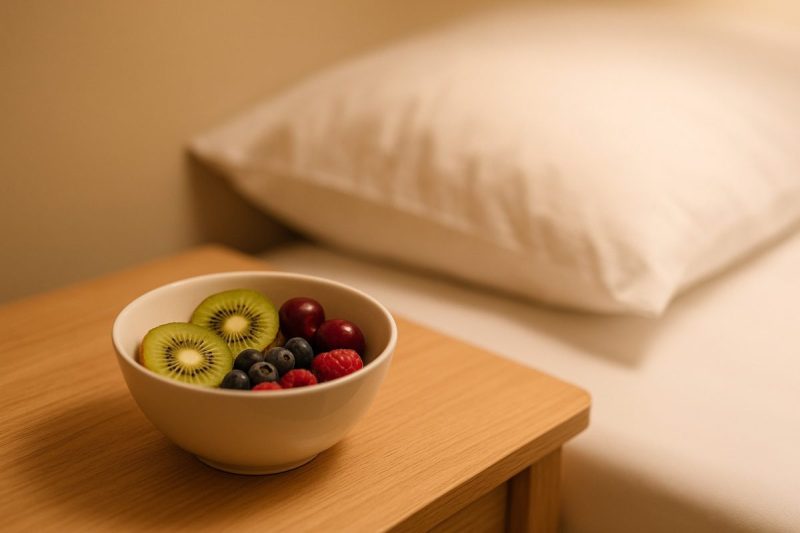 Bol cu kiwi, vișine, afine și zmeură pe o noptieră, pregătite pentru consum înainte de culcare, cu lumină caldă de lampă.