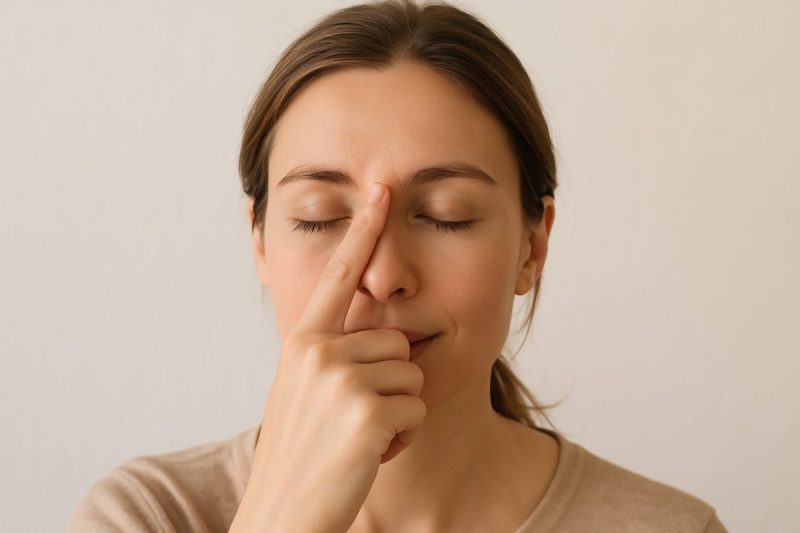 Apasă ușor cu vârful degetului arătător pe zona dintre sprâncene.