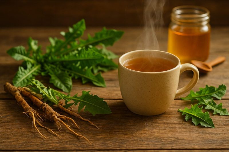 Cană ceramică cu ceai de păpădie aburind, alături de rădăcini și frunze proaspete de păpădie, pe o masă rustică din lemn, cu borcan de miere și linguriță de lemn în fundal, în lumină naturală caldă.