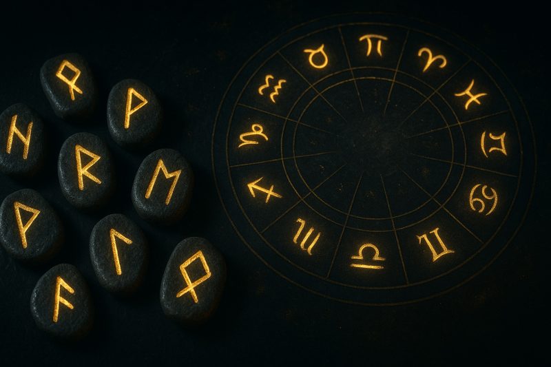 Simboluri runice și zodiacale pe o masă din lemn, ilustrând previziunile pentru iarna 2025–2026.